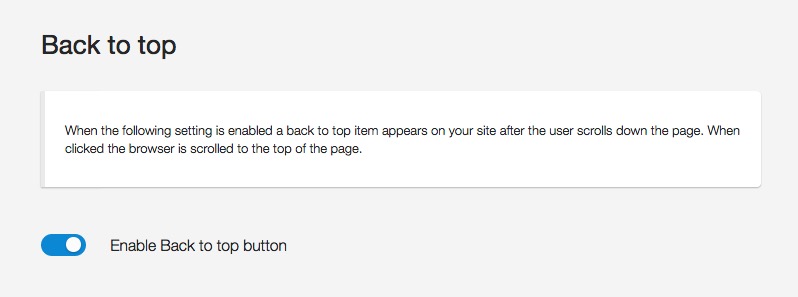 When back to top is enabled a link is displayed in the bottom of the window when a user scrolls down the page. When the link is clicked the viewport is smoothly scrolled back to the top of the page.
