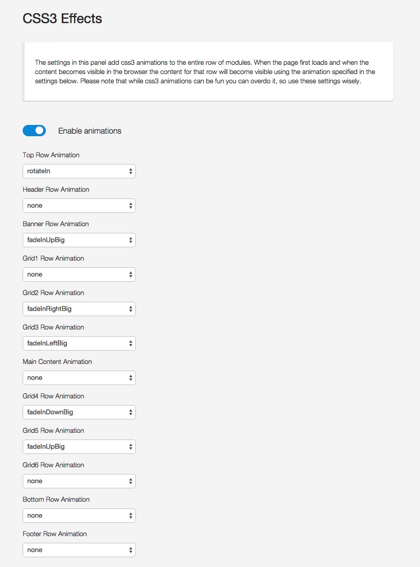 ZGF4 based themes integrate the animate.less library combined with the wowjs script to provide some fun fading, sliding and scrolling effects to entire rows of your content.Effects are easily assigned to specific rows in the template settings and allow you to determine how the content loads on the page when the content becomes visible. Used in conjunction with the one page mode this can help to create a lively experience for your visitors.