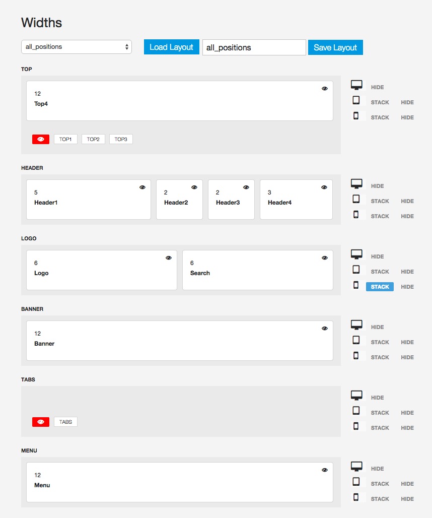 The layout tool is inspired by the T3 Framework's layout tool with some key modifications in workflow. We have simplified the behaviour for the template across different screen sizes by adding simple toggles for either hiding or stacking modules at various screen sizes.